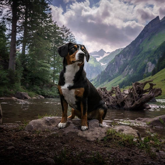 The Entlebucher Mountain Dog is one of the four Sennenhunds, or Swiss Mountain Dogs, the other three being the Greater Swiss, Bernese, and Appenzeller. The word Senn is the term for Alpine herdsmen, so a Sennenhund is a 'dog of the Senn'. Traditionally the Entlebucher Mountain Dog was a cattle driver, as secondary tasks they were used to protect the livestock, as property guards and for general farm work. The Entlebucher Mountain Dog is a medium-sized, high-energy Swiss herding breed known as the smallest of the four Sennenhund (Swiss Mountain) dogs. They are intelligent, loyal, and athletic, characterized by a tricolor coat (black, tan, white), 16โ21 inch height, and 45โ65 lb weight. They require intense daily exercise and mental stimulation. The Entlebucher Mountain Dog is a people-dog that loves to be surrounded by his people and friends. Alert and very eager to please, it was first used as a cattle driver; today it is used as a livestock guarder and a companion. Entlebucher Mountain Dogs are loyal, smart dogs with a fun-loving personality - they are even sometimes called the "laughing dogs" of the Swiss Alps. They are affectionate with their family, but they might need time to warm up to strangers. As with all dog breeds, early socialization is important. Entlebuchers can be good with children, cats, and other dogs as long as they are well socialized from puppyhood.