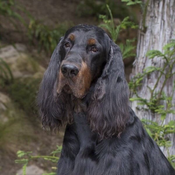 The Gordon Setter is a large, sturdy Scottish hunting dog, known for its lustrous black and tan coat, high intelligence, and loyal yet stubborn temperament. Weighing 45-80 lbs, these active dogs need significant daily exercise and thrive on human companionship. They are slow to mature, often retaining a puppy-like nature for years. Gordon Setters can be black, but according to official breed standards, they must have black and tan coats rather than being solid black. They are famously "coal black" with distinct chestnut or mahogany tan markings on their eyebrows, muzzle, throat, chest, and legs.