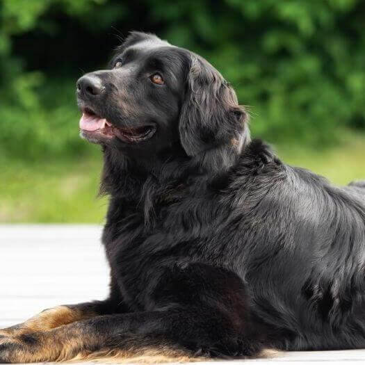 Flat-coated Retrievers are not only one of the happiest dog breeds but may be among the happiest creatures in the animal world. Their high energy levels paired with their goofy personas provide endless entertainment for their humans and visitors. They get along well with kids, strangers, and other pets, making them easy to bring along with you. What sets flat-coated retrievers apart from other retrievers is their shiny and slightly wavy black or liver coats with no patterns or makings. Bouncy, silly, and fun-loving, the flat-coated retriever is often mistaken for a black-coated golden retriever, a more familiar breed. Flat-coated retrievers are more active and athletic and require more exercise. The breed's lustrous, straight coat lies flat, hence its name. The flat-coated retriever comes in two solid colors: black and liver (chocolate brown), although black is far more common.