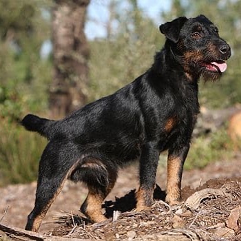 The Jagdterrier (German Hunt Terrier) is a small, tenacious, and versatile working dog developed in Germany after World War I to hunt both above and below ground. Weighing 17โ22 lbs and standing 13โ16 inches, they are intelligent, high-prey-drive, and intense dogs, primarily black/dark brown with tan markings, needing intense exercise. Jagdterriers (German Hunt Terriers) can be primarily black, and this is a standard coat color for the breed. They are usually black or black and gray with clearly defined tan or rust-colored markings on their muzzle, eyebrows, legs, and chest, although dark brown is also possible.