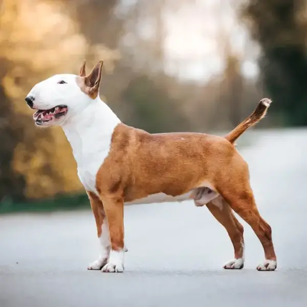 The Bull Terrier is a breed of dog in the terrier family. There is also a miniature version of this breed, the Miniature Bull Terrier. This breed originates in England, where the bull and terrier breeds were originally bred for vermin control and bloodsports. Bull Terrier is a brachycephalic, or "short-headed," dog breed with a shortened snout that can lead to respiratory issues. While not as severely affected as some other breeds, they are still prone to difficulties breathing, heat intolerance, and are at risk for conditions like BOAS (Brachiocephalic Obstructive Airway Syndrome), especially if they are overweight or experience stress. Modern Bull Terriers have an arched, egg-shaped skull and a shortened snout that can make breathing harder than for dogs with longer muzzles. The shortened snout can cause narrower and flatter breathing passages, making breathing difficult and leading to snoring, snorting, and a struggle for air, especially during exercise. Like other brachycephalic breeds, Bull Terriers are sensitive to high temperatures and are at increased risk of heat stroke because panting, their primary cooling method, can be less efficient. The severity of respiratory problems can be exacerbated by factors such as being overweight, age, stress, excitement, or other health issues like heart failure. To help with breathing, it is recommended to attach a leash to a harness instead of a collar to avoid putting pressure on the trachea. Keeping them lean is also crucial, as obesity makes symptoms worse.