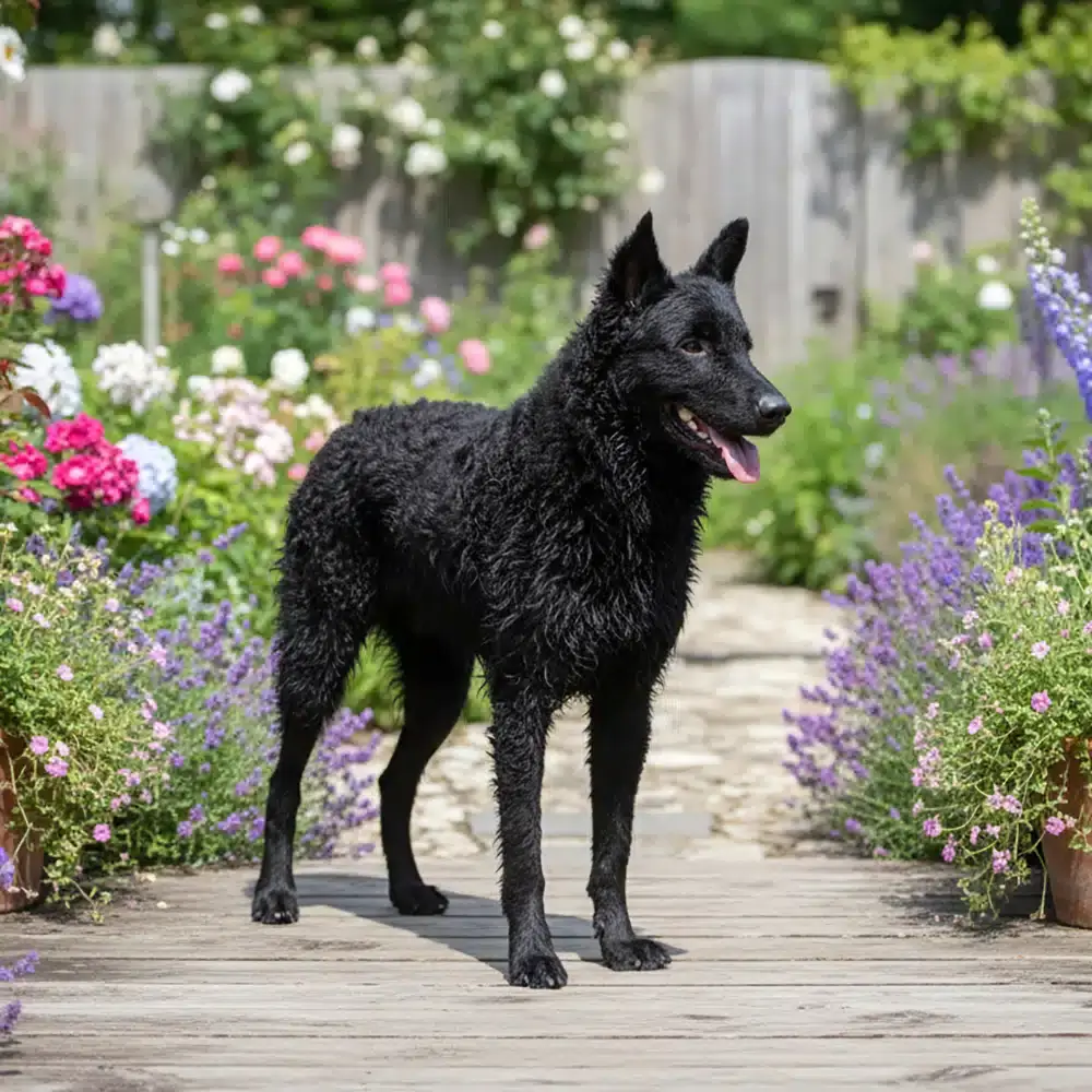 The Croatian Sheepdog (Hrvatski Ovฤar) is an ancient, medium-sized, intelligent, and energetic working breed. Known for its all-black, curly or wavy coat andfox-like head, it is a devoted, alert, and trainable breed, ideally suited for herding but requiring active, firm handling. The Croatian Sheepdog is an alert, agile, keen and intelligent dog with enormous energy and a strong need for human leadership. It is healthy, resistant to disease and inexpensive to keep. It possesses a well-developed herding instinct and is an excellent watchdog. An instinctive herder, it is wary of strangers. If socialized early, however, it responds well to obedience training. As a pet without early obedience training and exercise to occupy its athletic body and excellent mind, it can become very noisy, even destructive. Sometimes incorrectly labeled as a livestock guardian, it often works with a large dog that specializes in defense of the flock, such as the Karst Shepherd or Sarplaninac. Aside from sheep, it is adept at herding cattle, pigs, and horses.