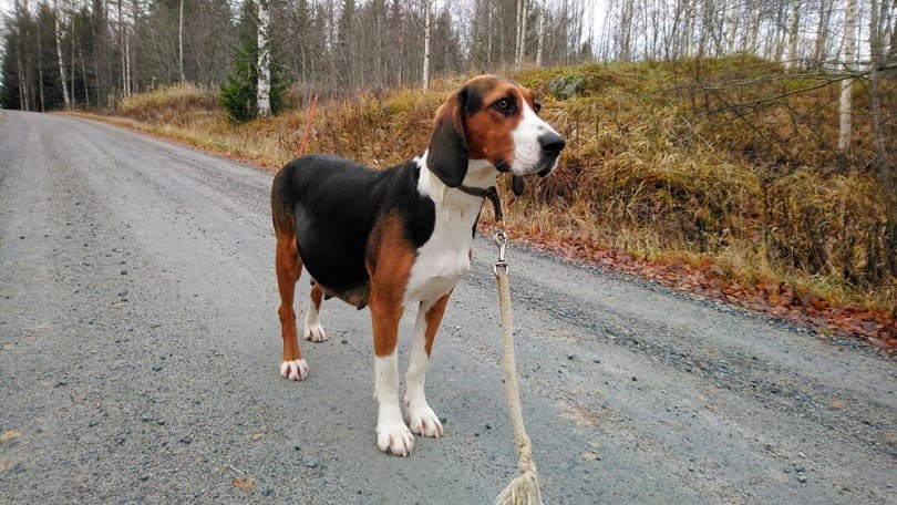 The Finnish Hound (Suomenajokoira) is a medium-sized, tricolor scent hound developed in Finland for hunting hares and foxes. Known for immense stamina in cold weather, they are energetic outdoors but calm, friendly, and loyal indoors. They are independent trackers, typically weighing 45โ55 lbs and standing 20โ24 inches tall, requiring significant daily exercise. Friendly, calm and never aggressive, yet energetic in the hunt, the Finnish Hound is used as a hunting dog for hare and fox by following the scent. Eager to hunt in difficult circumstances. He works independently, is a versatile tracker and pursues the quarry with passionate barking. Make sure you are this dogโs calm, but firm, confident pack leader to prevent behavior issues. Proper human to canine communication is essential. The Finnish Hound is found predominantly in Finland and is used almost exclusively for hunting hare or fox. The breed is usually calm and friendly, which means they make for a good family pet. Keep in mind that this breed tends to bond closely with their owners, and they donโt do well when left alone for long periods. Because of their stubborn streak, they also arenโt necessarily the best option for novice dog owners. As an active hunting dog, the Finnish Hound requires plenty of exercise to avoid boredom. When properly cared for, they make intelligent, high-spirited, and friendly companions. They are also good family pets since they get along well with other animals and children. Finnish Hounds are easy to train; itโs important to do so early and steadily since their hunting instincts can kick in on a whim.