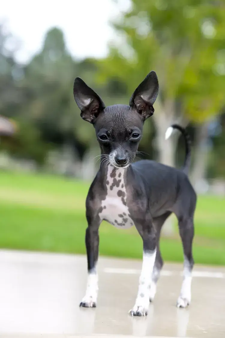The American Hairless Terrier is an energetic, intelligent, and playful small to medium-sized dog breed that originated from the Rat Terrier in the United States. They are known for their hairless coat, but also have a coated variety, and are often considered a good option for some allergy sufferers. Their temperament is curious, alert, and protective, and they thrive with training and mental stimulation. Though the cute American Hairless Terrier does not have any fur (aside from eyebrows and whiskers found on some pups, that does not mean these dogs do not need grooming. It is important to keep their skin moisturized, protected from hazards, and clean. Special care should also be paid to their teeth, ears, and nails. These dogs can be great playmates for children thanks to their rambunctious energy. American Hairless Terriers are known to be intelligent and full of energy. While they are content being indoor lap dogs, they still require regular exercise. Theyโre very trainable, so keeping their mind occupied with obedience and trick training is a good place to start. Like all terrier dog breeds, American Hairless Terriers are known to be affectionate, playful, and inquisitive. Regular walks and indoor playtime will keep them happy. Also like all terriers, these dogs can be watchful and bark to alert their family to visitors or strange noises. Proper training, exercise, and mental stimulation can help reduce excess barking. What the AHT lacks in fur they make up for with an energetic, bright, and fun-loving personality. If you are looking for a big personality in a little body, and one that is likely to be a bit of a challenge but lots of fun, then the American hairless terrier could be for you. However, if you are looking for a little lapdog, this is not the breed for you. The dog may be small, but is driven, athletic, and has lots of stamina.