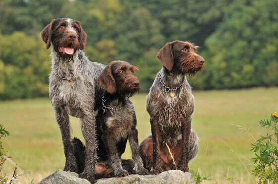 German Rough Haired Pointers thrive when provided with lots of mental and physical exercise. Because they're sporting dogs, they may chase or hunt small animals, including cats, other small pets, or wildlife. The breed is intelligent and eager to please, making training relatively straightforward with consistent and positive methods. Early socialization and training are recommended to ensure they develop into well-rounded dogs. German Roughhaired Pointers require plenty of daily exercise, ideally involving activities that engage their mind and body such as hunting or tracking games. Lack of exercise can lead to behavioral problems. The principal difference between the breed and the German Wirehaired Pointer is the head. It is heavier and broader, a trait it inherited from its shepherd forebears; it has hanging ears and particularly long eyebrows that give it an almost threatening appearance. The breed's stiff, harsh and bristly coat is usually 37 millimetres (1.5 in) long; they can be solid brown, brown roan or light roan in colour. Some have a white patch on their chest whilst some roan examples also have brown patches in their coats.