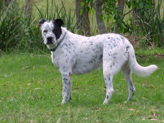 The Bull Arab is a spotted dog from Australia, where it was developed as a dog for wild pig hunting. Like other bull breeds, it is characterized by a sturdy, but athletic body. It is known for its intelligence and physical endurance. The Bull Arab's coat is short and appears in a variety of colors. The most common is white with reddish spots all over the body. The Bull Arab is a large, active dog breed developed in Australia for pig hunting, created by crossing breeds like the Bull Terrier, Greyhound, and German Shorthaired Pointer. Known for being loyal, intelligent, and energetic, they are best suited for experienced owners in a secure, active environment with ample daily exercise. They can make good guard dogs and loyal companions but have a strong prey drive, requiring proper socialization and training. Kind, even tempered, independent and active. Bull Arabs are a versatile breed, making excellent watch dogs with enduring stamina and desire to play. They like to perform tasks independently and have a busy character but can also be bad-tempered, dominant, stubborn, and overly confident. If they are well trained and socialised, Bull Arabs are very kind, loyal and obedient companions and excellent family pets. Despite their drive to hunt, they are remarkably even-tempered and calm โ when they are not on the trail of wild boars or wandering sheep โ and they can be trained to remain relatively restrained around other animals. When kept indoors or confined to an average-size yard, these dogs tend to be somewhat laid-back and inactive, which can lead to an accumulation of pent-up energy. This may manifest in destructive behaviours such as chewing, whining, excessive barking and even destruction of property. Several attacks on people in several states of Australia have been allegedly attributed to the breed. Therefore, when around strangers, both of the human kind and other animals, a Bull Arab should always be strictly supervised, and it is recommended to always leash or properly secure the breed when outdoors. Bull Arabs are friendly towards familiar adults and children. Unlike many other breeds of hunting dog, they are generally regarded as a suitable breed for families and are known to be playful and affectionate around children. Smaller children can be easily injured if a dog as large as a Bull Arab gets a little too excited during playtime. It is easier to manage a Bull Arab when there are no other pets in the home and no wild animals in the vicinity. Because of their strong hunting instincts, Bull Arabs tend to chase both smaller and larger animals and livestock and can attack and even kill sheep or other medium-sized animals. They also tend to dominate other dogs. On the other hand, many Bull Arabs get on fine with other dogs and cats, if socialised well together from a young age.