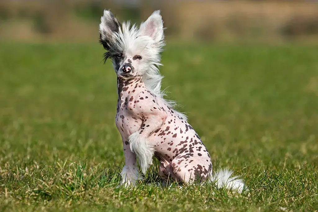 The Chinese Crested is a lively and alert toy breed that comes in two varieties: the hairless, with tufts of hair on its head, feet, and tail, and the "powderpuff," which has a full, soft, and silky coat. They are affectionate, intelligent, and have a playful and loyal personality. Owners should be prepared for specific care needs, including high grooming for both types, skin care for the hairless variety, and a moderate need for exercise. The Chinese Crested is another mainly hairless dog thatโs certainly unmistakable. These pups have smooth, pink-spotted bodies with a fluffy hairdo, feet, and tail. Experts do not know a lot about the origin of these ancient dogs. However, according to the AKC, they are descendants of large, hairless dogs brought to China from Africa. This iconic breed can be many different colors. These include apricot, black, blue, and chocolate. They can also have white and spotted markings. These pups are very affectionate to those they know - both humans and furry, but can be wary around strangers. Socialization is crucial if theyโre not to become too anxious. Chinese Crested dogs are agile but do not expect them to want to go out for long walks. They are quite happy relaxing at home and occasionally chasing after a ball. Exercise is, however, important for their mental and physical health. The most popular of the hairless breeds, the Chinese Crested is still very rare. These dogs are alert, charming, agile and lovable. Though affectionate and playful with children, children should be taught not to be rough with this breed as it is friendly, but it does not have the protective hair that other breeds have and can get injured easily. It is an entertaining and amusing companion. Do not baby this breed or you might cause it to be timid. Socialize your dog well, starting when it is a small puppy, exposing it to loud noises and outside activity. This intelligent dog has the ability to perform tricks. They are generally good with other pets. They are not barkers. Chinese Crested Dogs like to climb and dig holes. They tend to become very attached to their owners. These dogs enjoy companionship and need constant human leadership. Chinese Cresteds are happy and alert dogs. The Chinese Crested is a dog with some rather cat-like quirksโaccording to the breed club, the breed is known to perch on the back of couches, much like felines do. But they are also eager to please their people and form strong bonds with those they love. Cresteds crave attention, and they might get a little needy if they donโt get enough affection.