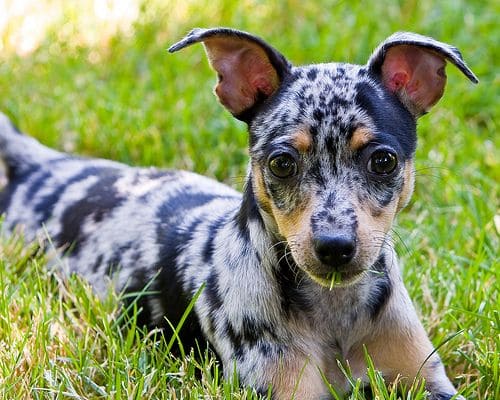 The Catahoula Leopard Dog is a strong, intelligent working dog from Louisiana known for its striking coat and blue eyes. These dogs are energetic, independent, and require a confident owner, plenty of physical and mental stimulation, and early socialization to become loyal and affectionate companions. They are bred for hunting and herding, often used for hog and cattle work, but can also be great family pets if their high energy needs are met. The Louisiana Catahoula Leopard Dog is independent, protective and territorial. Loving with its family and all people it knows well but can be reserved with strangers (this would include strange children). Socialize well, preferably at a young age. They need to be allowed to come up and smell a person. They mature right around 2 years of age. Affectionate with his master. The Catahoula is not recommended for an owner who does not take the pack leader issue seriously. For the right owner who understands the importance of structure, leadership, and exercise the Catahoula can make a wonderful pet. The objective in training this dog is to achieve pack leader status. It is a natural instinct for a dog to have an order in their pack. When we humans live with dogs, we become their pack. The entire pack cooperates under a single leader. Lines are clearly defined and rules are set. Because a dog communicates his displeasure with growling and eventually biting, all other humans MUST be higher up in the order than the dog. The humans must be the ones making the decisions, not the dogs. That is the only way your relationship with your dog can be a complete success. This breed needs a dominant owner who shows strong leadership. Catahoula Leopard Dogs have been bred to be hard workers, enduring the swamps and forests of the South for their stock work. This means that when they are not working, Catahoulas have high energy needs that must be met. As working dogs, Catahoula Leopard Dogs have abundant energy stores. If they are not working, they require at least one or two hours of exercise every day, which should not be limited to walking. Running, fetching, or dog sports such as agility are great ways to exercise a Catahoula Dogโs mind and body. A Catahoula Dog that is not given the exercise it needs will often become destructive. Because of their history, it might be challenging to introduce a Catahoula to another pet. That said, some can do well in a home with other dogs and cats if theyโve been raised with them. Their loyalty to their family makes them great family dogs, especially in homes with older children who understand how to interact with dogs. But smaller children may be accidentally knocked down or stepped on by this rambunctious breed, so always supervise interactions between kids and Catahoula Leopard Dogs. Their instinct for independence can make Catahoulas wary of unfamiliar people or animals, so early training and socialization are essential. While Catahoula Leopard Dogs do not tend to bark, they can be known to dig and chew when bored and therefore need ample time to play, ideally in a securely fenced-in yard.