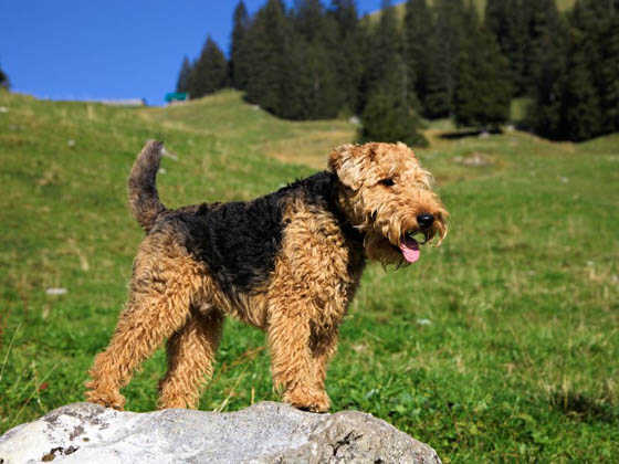 The Lakeland Terriers were bred to be fox hunters, dating as far back as the 1700s, making them one of the earlier terrier breeds. But unlike its other fox bolting compadres, the Lakeland Terrier was bred with the ability to kill its prey on the spot. And because of its earlier working environment in the rocky mountains of the Lake District of England, the Lakeland Terrier has developed great stamina from running with the hounds during hunts. The Lakeland terrier is a small terrier dog breed from England with a short, wiry coat that can come in an array of colors and does not shed much. While this dog is small in stature, they still have fairly long legs that allow them to be a sturdy, swift athlete. Their head is rectangular with small, V-shaped ears and fairly small, oval eyes. Overall, the Lakeland terrier dog breed resembles its larger cousins, the Welsh terrier and Airedale terrier. This is a little dog with a big personality, and was bred to be a fearless hunter. Though its appearance resembles that of a Welsh Terrier, the Lakeland Terrier does differ with a smaller build and long legs.